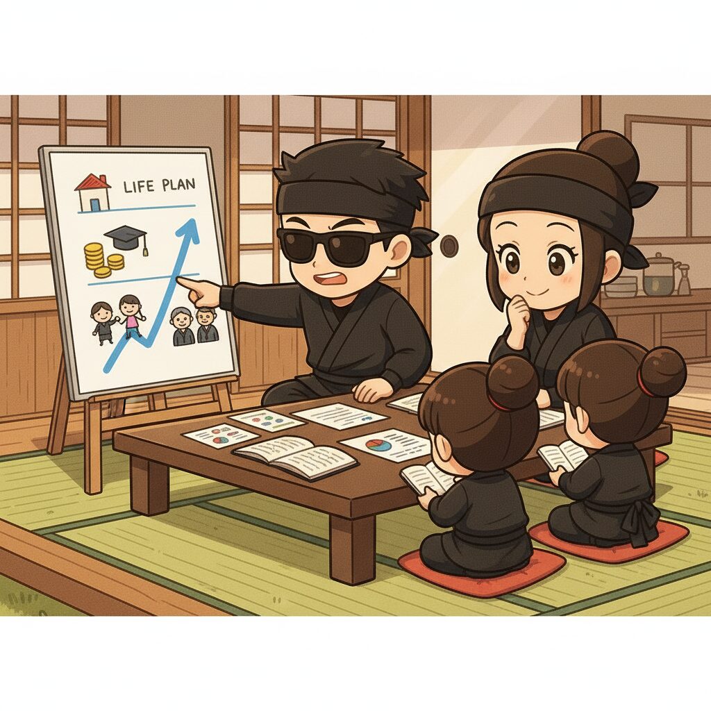 早期リタイア生活に入り、妻と二人の娘と暮らすわが家は、日々の生活費だけでなく、これから先に訪れるライフイベントへの備えも重要になります。ライフプランを立てる際には、毎月の家計簿の数字を追うだけでは不十分で、どの時期にどんなイベントがあり、どれくらいの費用が必要になるのかを把握しておくことが大切です。今回は日々の固定費や変動費については家計の前提として軽く触れるだけにし、教育費や結婚費用、車の買い替え、住宅の修繕、老後資金など、これからの人生で発生する大きな支出に主眼を置き、時期と金額の目安をまとめました。冒頭には、家族みんなで将来設計を話し合う様子をイラストにしました。