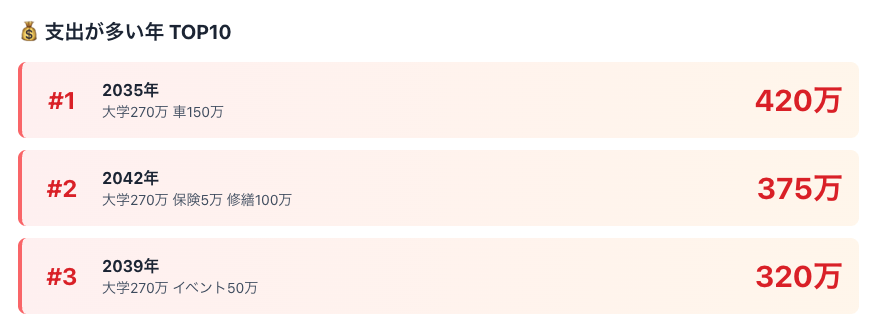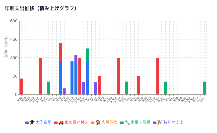 - 2035年:大学費用270万円と車の買い替え150万円が重なり、合計420万円の支出となります。